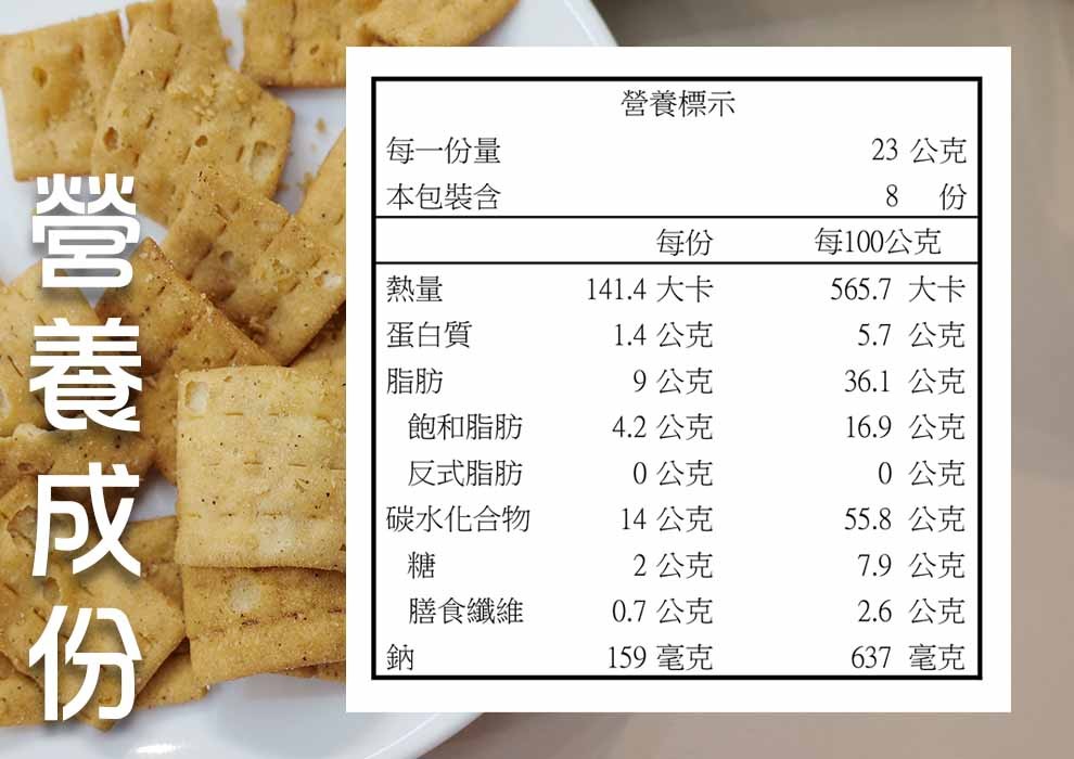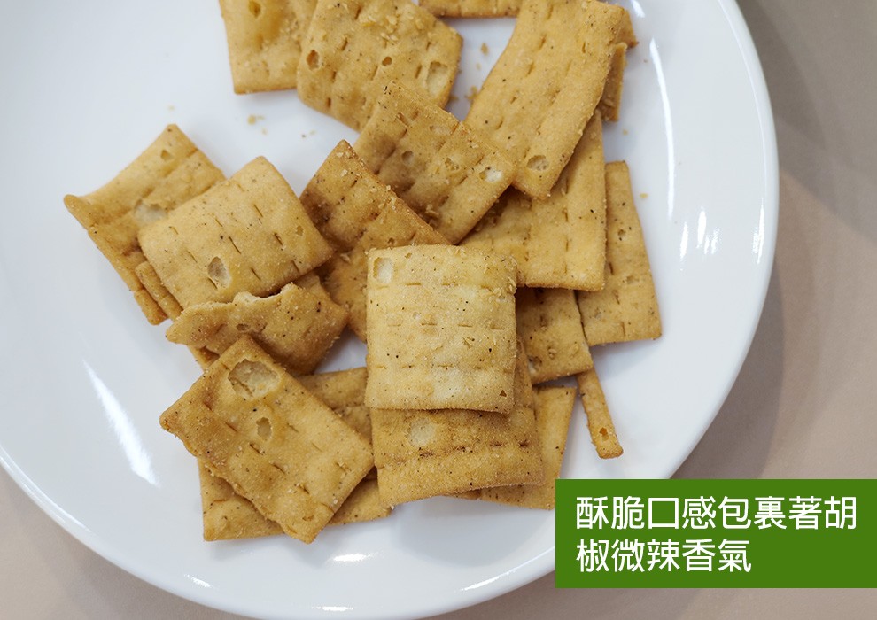 - 原料: 麵粉、精製棕櫚油 、砂糖、胡椒香辣風味調味粉(鹽、香辛料(黑胡椒粉、 香蒜粉、紅辣椒粉、花椒粉)糖、调味粉(L-麩酸鈉、琥珀酸二鈉、5'-次黃嘌吟核苷磷酸二鈉、5' -鳥吟核苷磷酸二鈉)、豆瓣粉【麥芽糊精、非基因改造黃豆小麥、非基因改造釀造醬油、黑麻油、焦糖色素 胺基乙酸、DL-胺基丙酸、氧氧化劑(異抗壞血酸鈉)】品質改良劑(二氧化矽、香料)、精鹽、黑胡椒粉 、白胡椒粉、膨脹劑(玉米澱粉 、碳酸氫鈉、酸性焦磷酸鈉磷酸二氫、碳酸鈣)、甜味劑(蔗糖素)