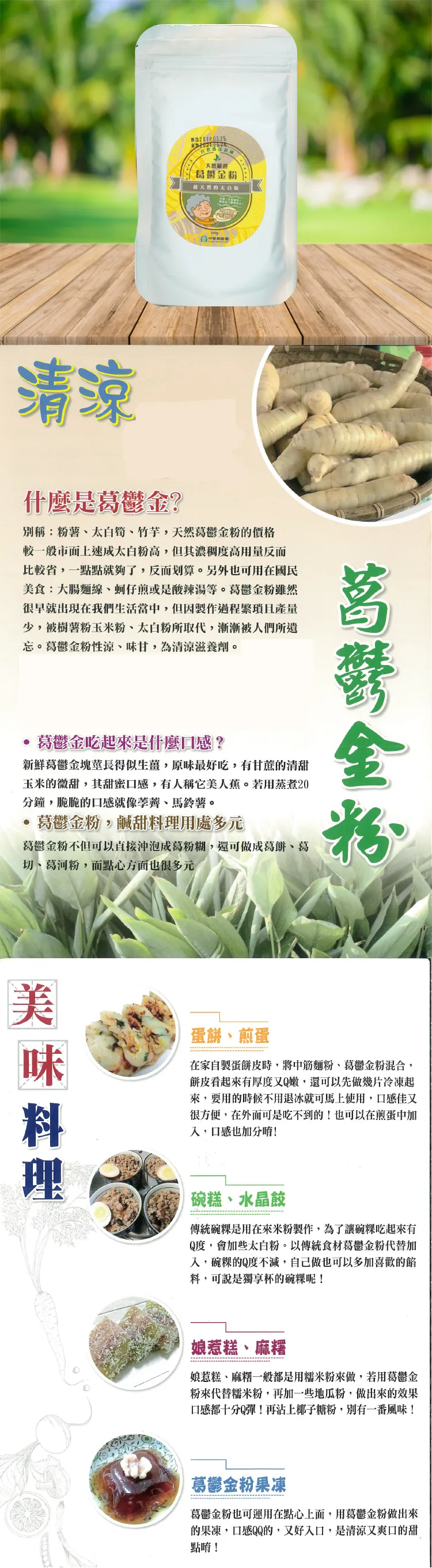 葛鬱金採其地下膨大塊莖,再將根莖部位清洗、搗碎、水洗、過濾(至少7次以上)、沉澱、曝曬,就是葛鬱金粉了,它的澱粉質地細緻而顏色純白,雖然天然葛鬱金粉的價格較一般市面上速成太白粉高,但其濃稠度高,用量反而比較省一點點就夠了,反而划算。另外也可用在國民美食:大腸麵線、蚵仔煎或是酸辣湯等。葛鬱金粉雖然很早就出現在我們生活當中,但因製作過程繁瑣且產量少,被樹薯粉、玉米粉、太白粉所取代,漸漸被人們所遺忘。