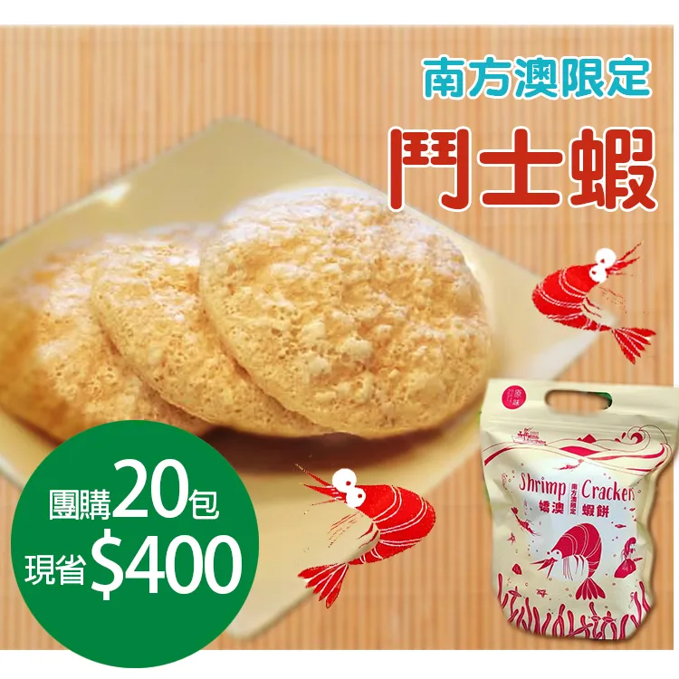 採用南方澳特產-長角鬥士赤蝦所製成,滿滿蝦味,在外面買不到!喜愛蝦餅的你絕不能錯過!