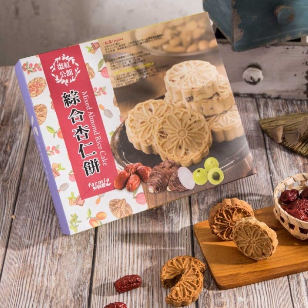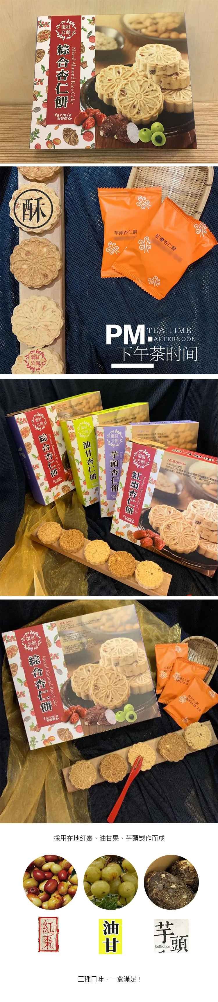 精選優質杏仁烘焙製成,加入公館在地各種食材,就成了下午茶、點心最佳選擇。口味:芋頭、紅棗、油甘