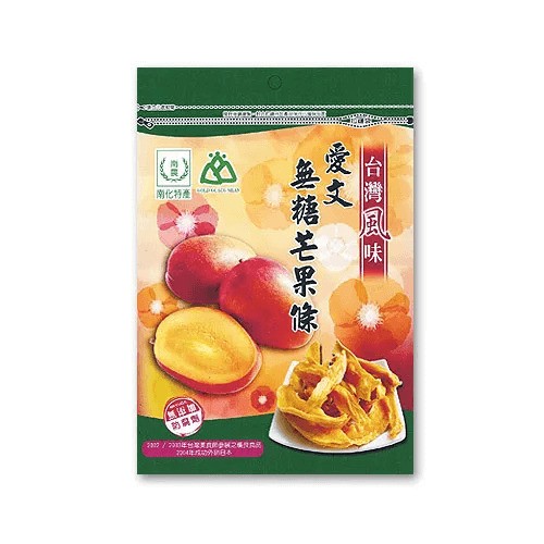 採用台南市南化果樹產銷班第24班生產果乾產品, 外銷果園生產愛文芒果、採收送驗通過才加工果乾。也許芒果給人就是很甜膩的印象無需再加糖。但我們成份中的糖是「製作過程」。延續古法將芒果熱水川燙後,浸泡於冰涼的「糖水」中;讓芒果形成一層糖衣。烘烤時隨著溫度升高,糖慢慢預熱融化脫落。這樣烘烤出的芒果乾,特別Q軟不硬口,更能完整留住芒果的香味。