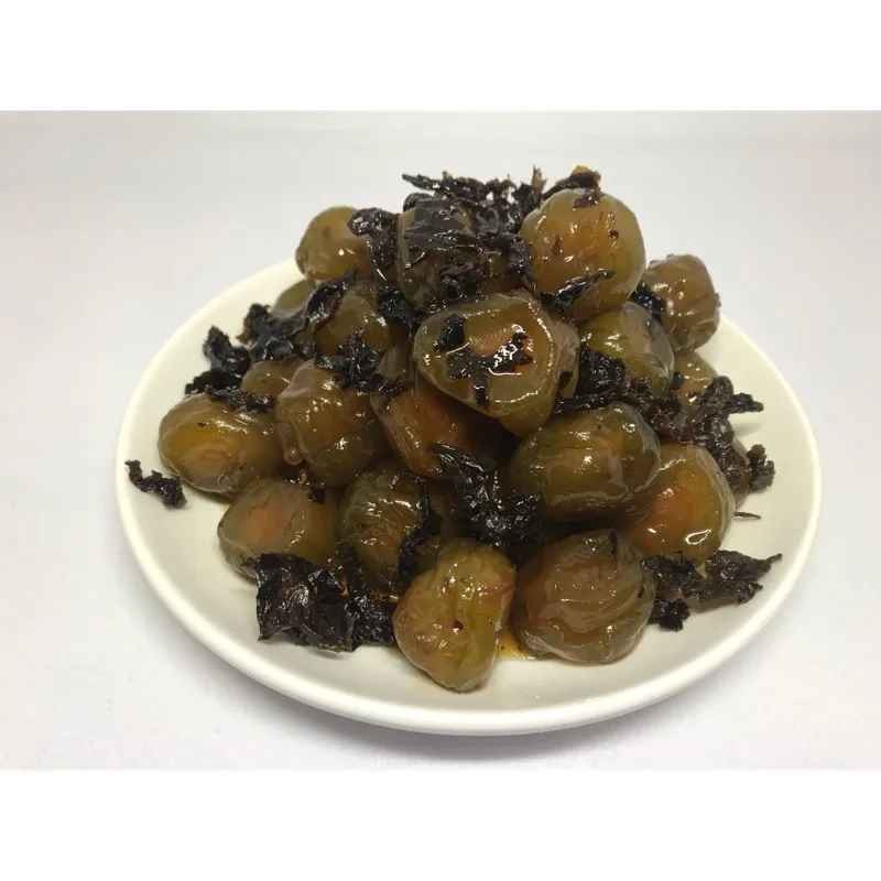 烏龍茶梅,伴著烏龍茶葉一起醃製,享受⽟⼭產區獨特⼭氣,讓茶香完全滲透進梅子裡,連梅核都滲有茶葉原始的香氣,清香奔放,口感Q彈不會太甜。