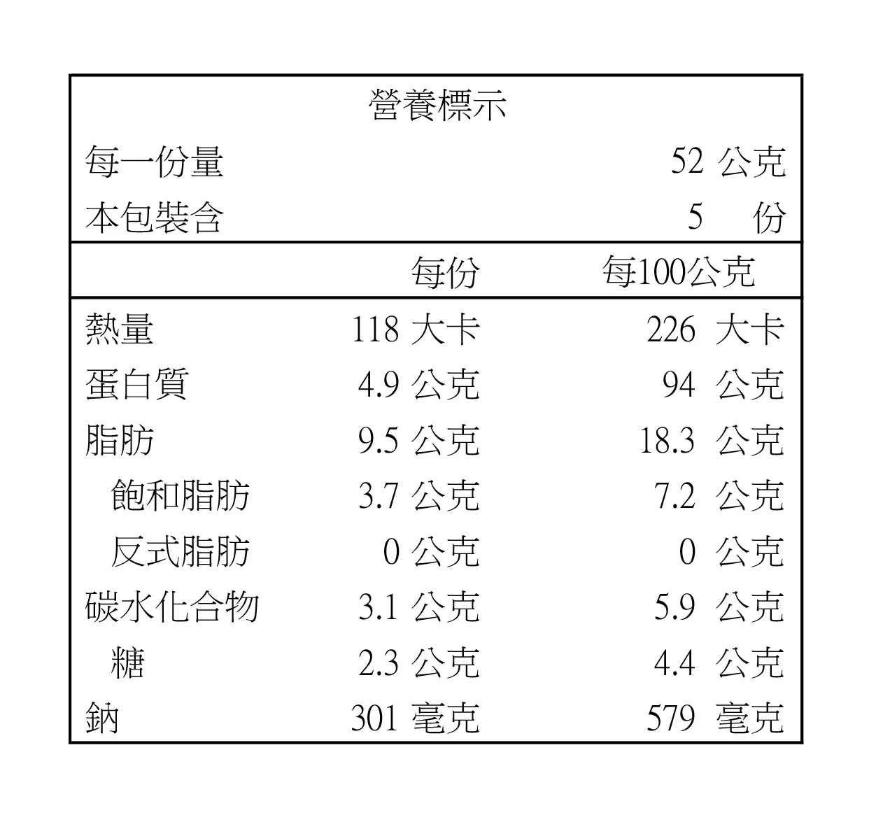 成份:水、豬肉(特選松阪肉及後腿肉)、釀造醬油、冰糖、青聰、紅蔥酥、洋蔥、大蒜、海鹽、紅麴、生薑、豬油、八角、黑胡椒粉。
