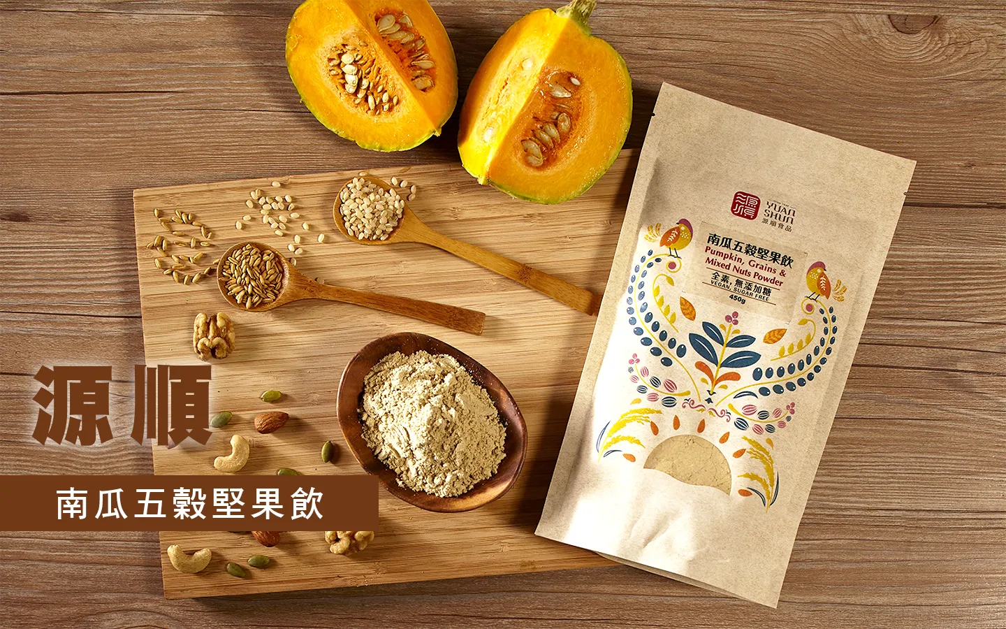 源順南瓜五穀堅果飲,使用當季新鮮南瓜,保留整顆南瓜外皮與南瓜子的完整營養,以專業技術熟化後研磨成粉,特別加入多種五榖雜糧,除了增加香味以外,也讓營養成分更加分。