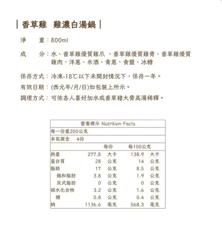 成分:水、香草雞優質雞爪、香草雞優質雞骨、香草雞優質雞肉、洋蔥、米酒、青蔥、食鹽、冰糖
