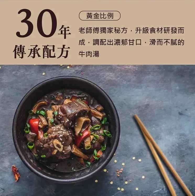 獨門牛肉滷包精選上等中藥材,經老師傅多年研究獨家配方,調配出濃郁甘口,滑而不膩的牛肉湯,無論是爽口的清燉口味,或是濃厚香醇的紅燒口味,都能輕鬆上桌。