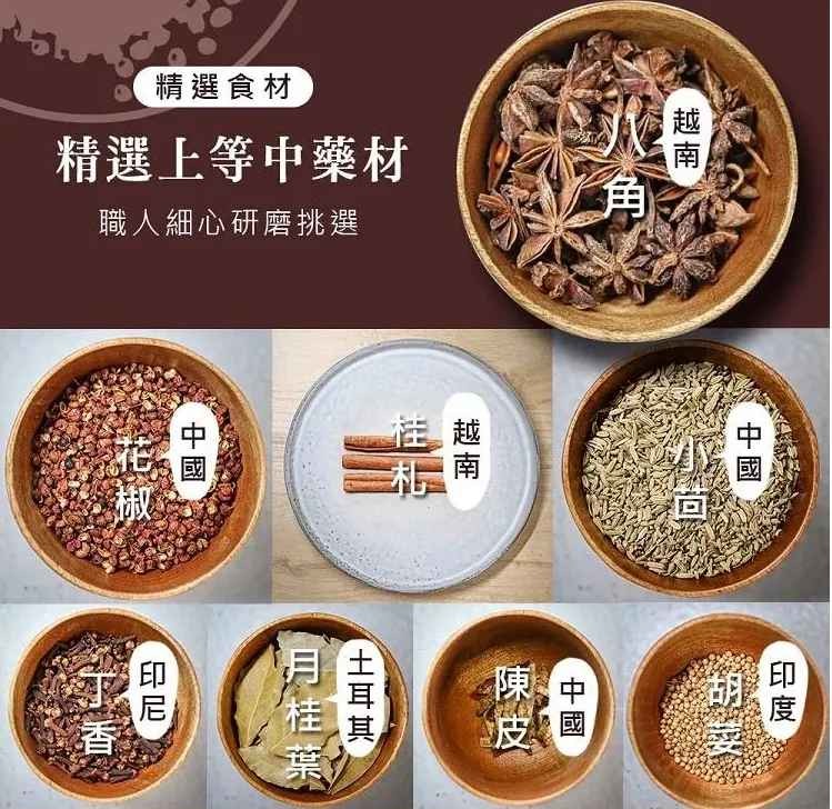 成分: 小茴、桂札、胡荽、八角、花椒、 陳皮、月桂葉、丁香