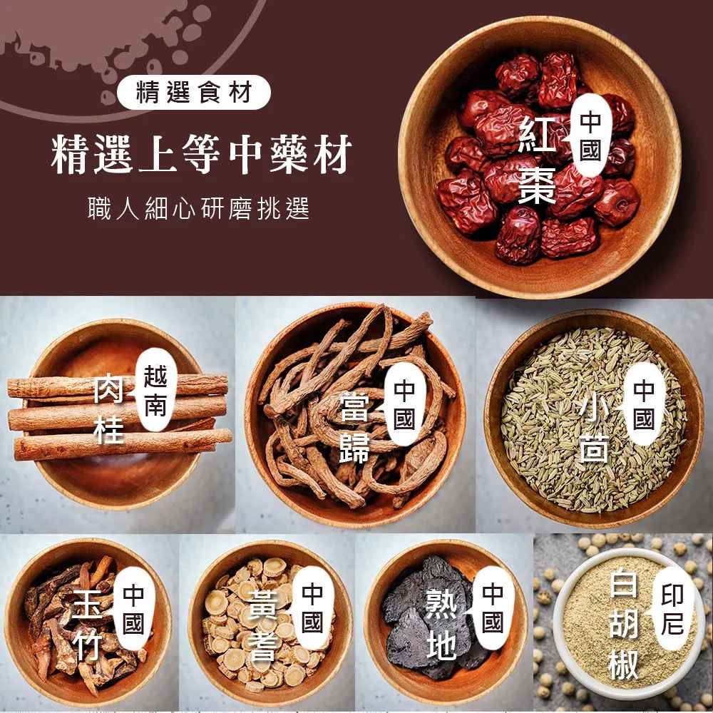成分: 藥材(肉桂、當歸、玉竹、黃耆、紅棗、熟地)、滷包(肉桂、小茴、白胡椒)