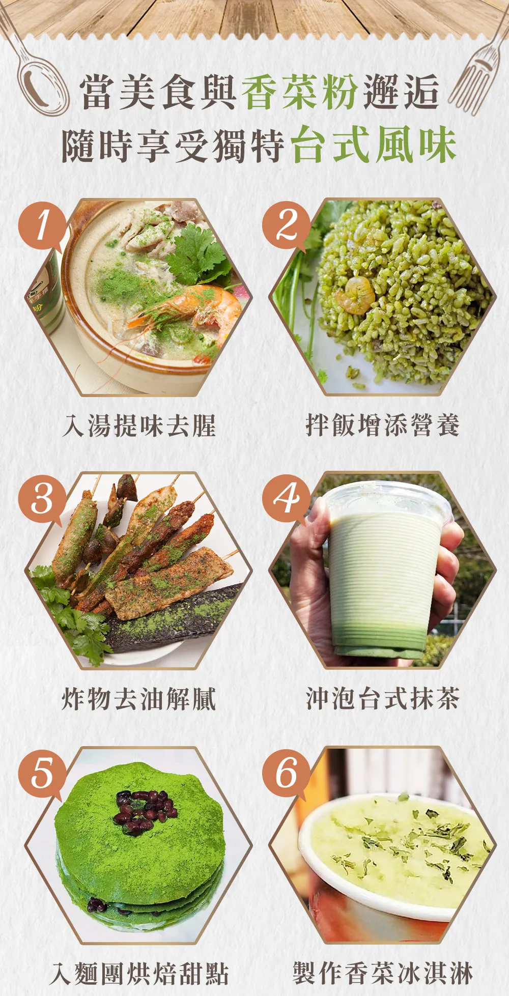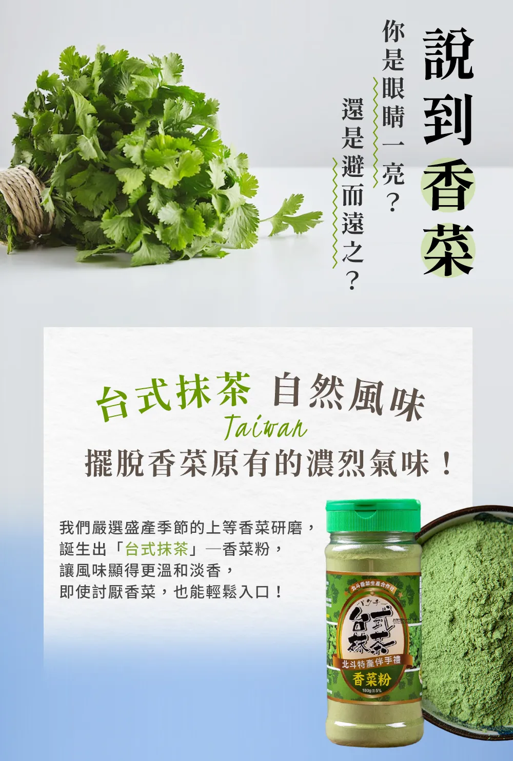 內容: (1)【香菜先生】香菜粉(細)180g/罐 台式抹茶沖泡或烘焙用 (2)【香菜先生】香菜末(粗)120g±5% 料理用