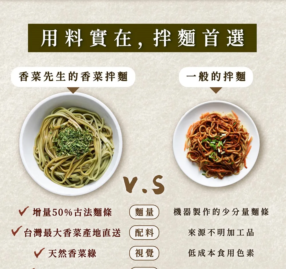 香菜富含高營養價值,使用新鮮香菜研磨成香菜粉,不添加任何色素,再融入特選高品質的麵粉,與30年製麵經驗師傅合作,量身打造出的麵條,結合香味十足的醬料,再搭配乾燥香菜末,成就出一碗具有獨特性、健康營養且口感Q彈滑溜的香菜拌麵。
