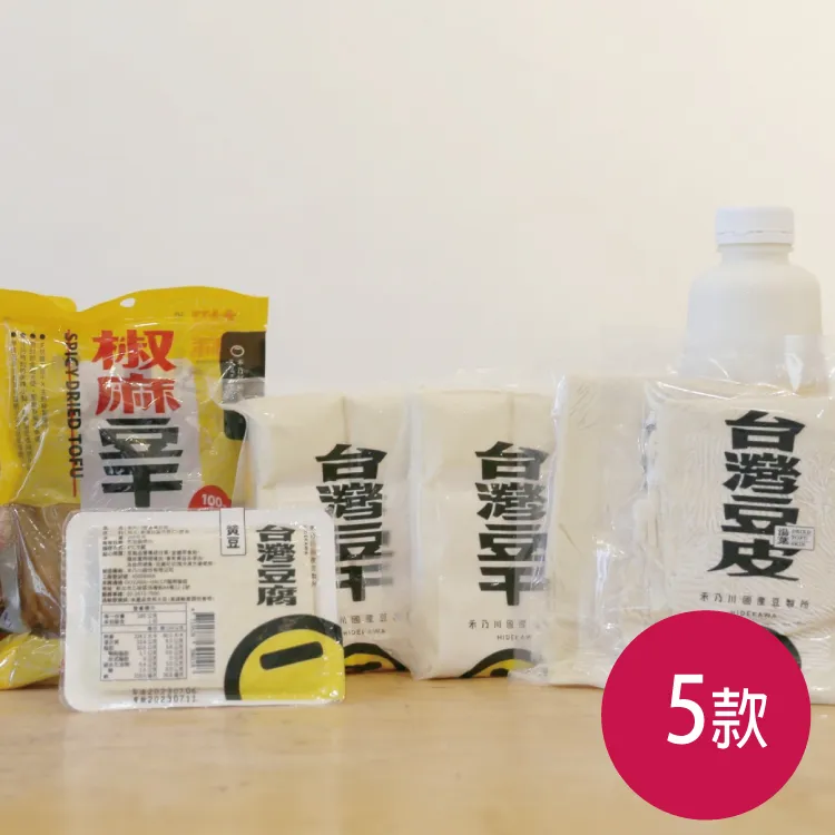 (1)純濃黃豆乳(無糖)*2瓶 (2)禾乃川黃豆皮*2包 (3)鹽鹵黃豆干*2盒 (4)鹽鹵黃豆腐 (5)椒麻豆干*2包