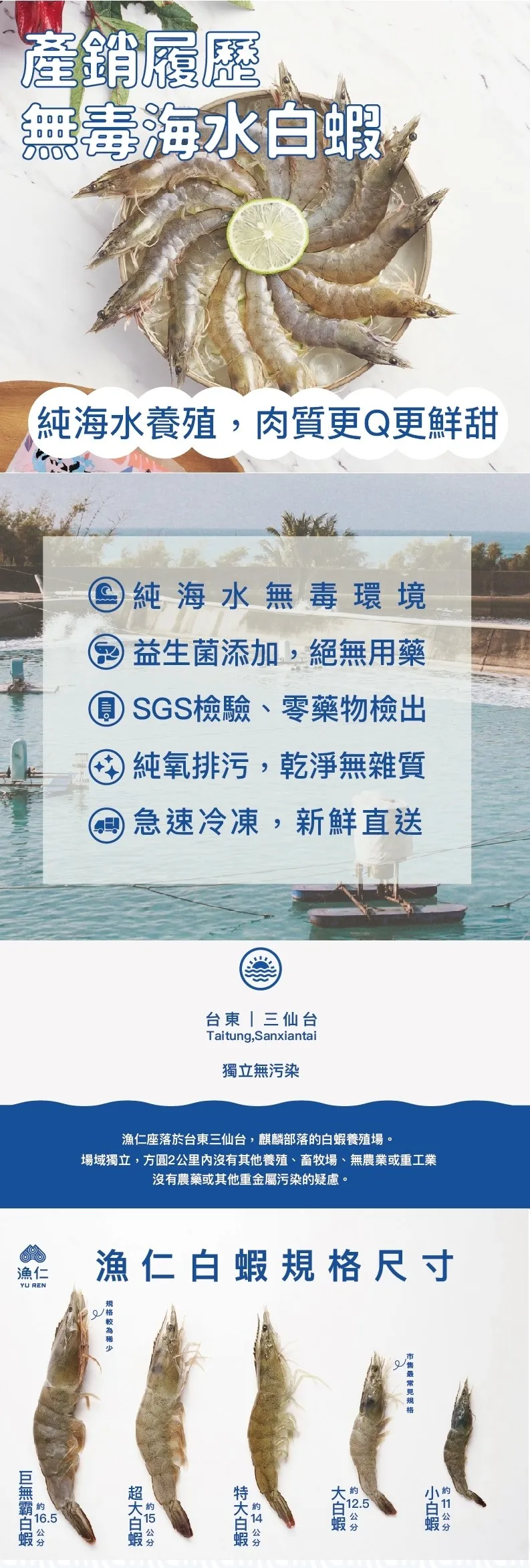 漁仁養殖池耗資打造獨立養殖池、引進水流集汙系統,杜絕了與周邊交叉污染重金屬、農藥、病毒的機會,更確保水質穩定且乾淨無汙染,是產銷履歷的認證無毒白蝦,其中78項藥物殘留測試全數通過