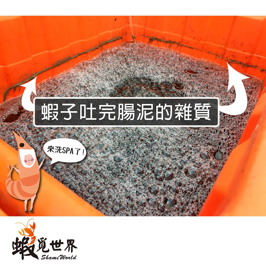 >讓蝦子在充滿氧氣的養殖桶中做SPA,讓蝦子把腸內的腸泥盡量排空
