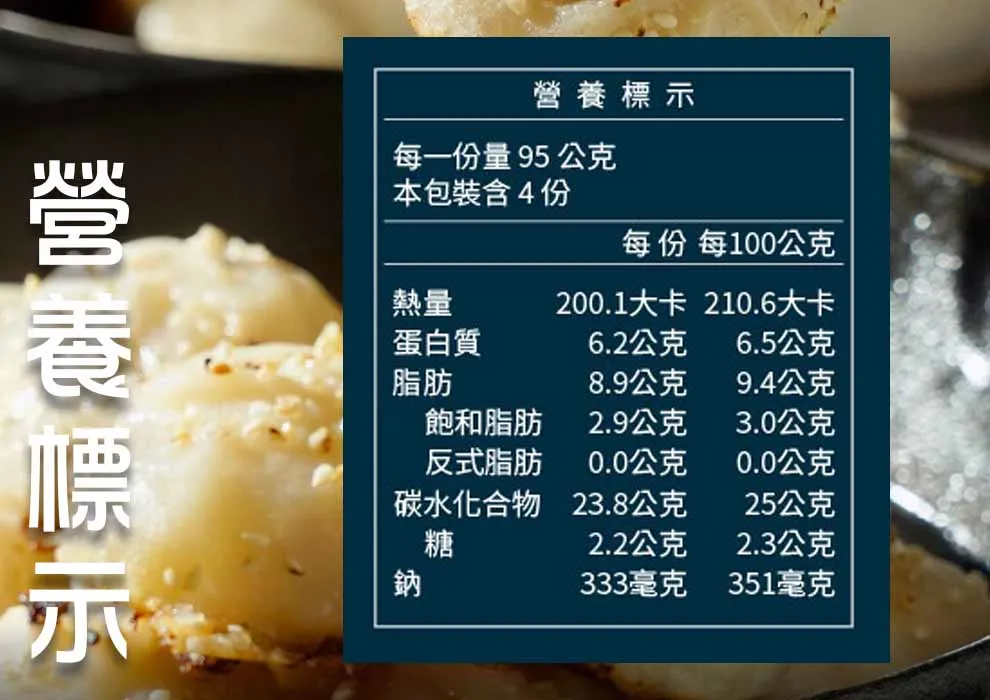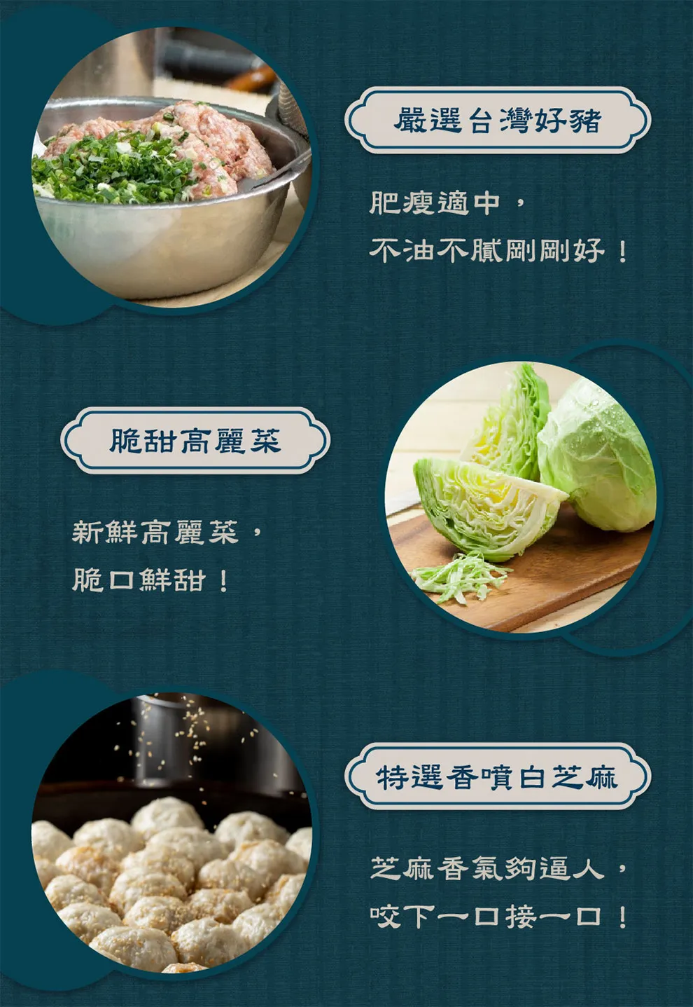 成分 : 麵粉、高麗菜、豬肉(台灣)、水、芝麻油、醬油、糖、芝麻、薑、胡椒