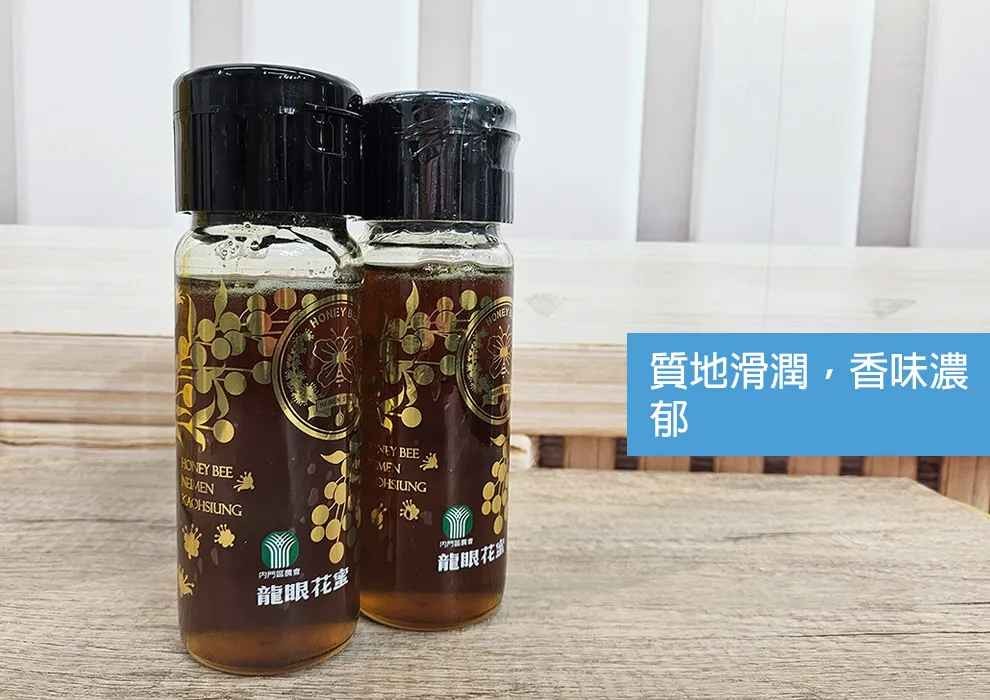 蜜蜂採集龍眼花朵分泌的花蜜,質地滑潤,香味濃郁色澤呈琥珀色,甜蜜而後帶香醇龍眼味