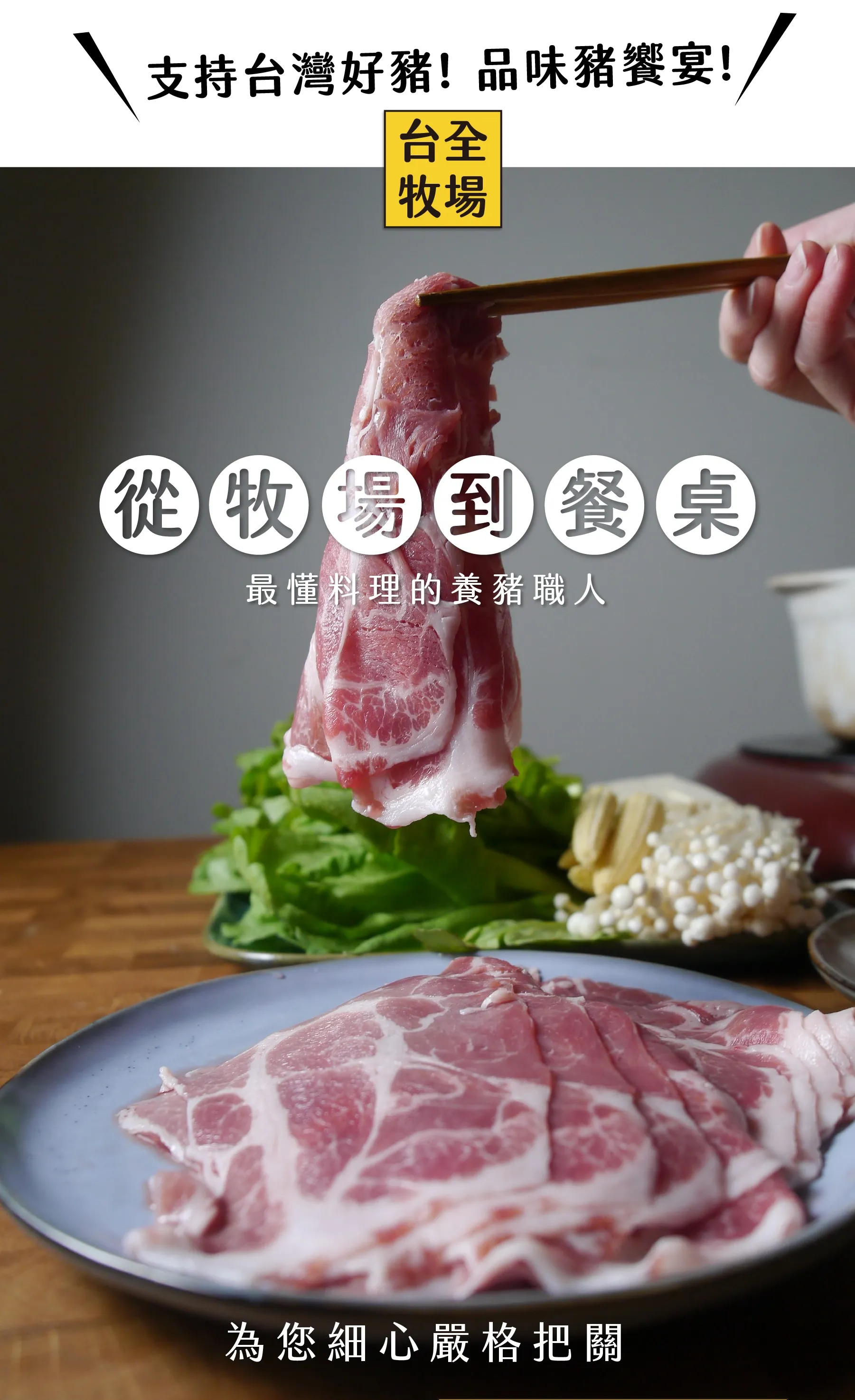 單一牧場,從培育小豬開始,從牧場到餐桌上,養豬職人細心嚴格把關。真正做到為消費者層層把關!台全牧場團隊精心研發出肉質鮮美、肥瘦均勻的健康「快樂豬」,是台全牧場堅持的信念!