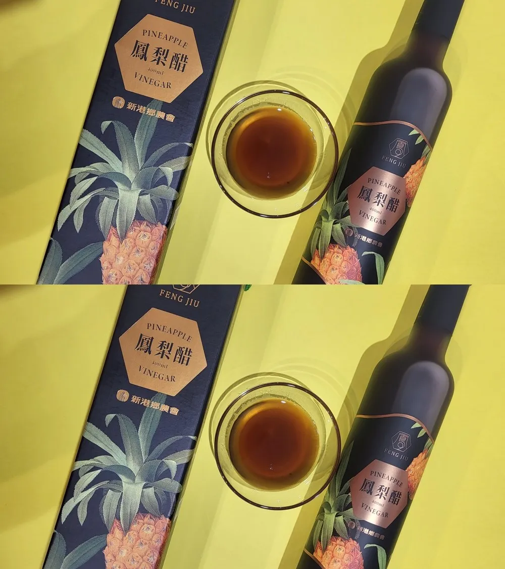 新港鄉農會從二○一五年起經營蔬菜專區,打造「蔬活力」(SHE,Safe Health Energy)品牌,為農產品拓展多元銷售通路。起因於農會看見了新港鳳梨不及其他縣市鳳梨產區的名氣,在行銷上相對弱勢。此外,鳳梨生產期長達一年半才能成熟,再加上拍賣市場的價格時有起伏,在在影響農民生計。因此,農會苦思開發加工品,誕生了「鳳九」品牌的第一支產品——以新港特色品種台農 17 號釀製的鳳梨醋,香氣風味口感獨特。