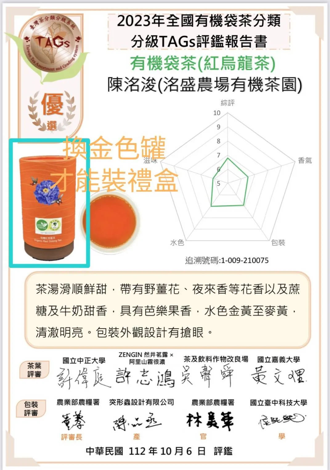 來自南投洛盛農場的有機紅水烏龍茶,茶湯顏色橙黃或琥珀,色澤明亮、香氣淡雅滋味鮮爽,帶有甘味且滑潤,飲後回韻無窮。因製茶工序繁複且製作難度高,坊間已逐漸稀少。此品得來不易,值得愛喝茶的行家珍藏品茗。