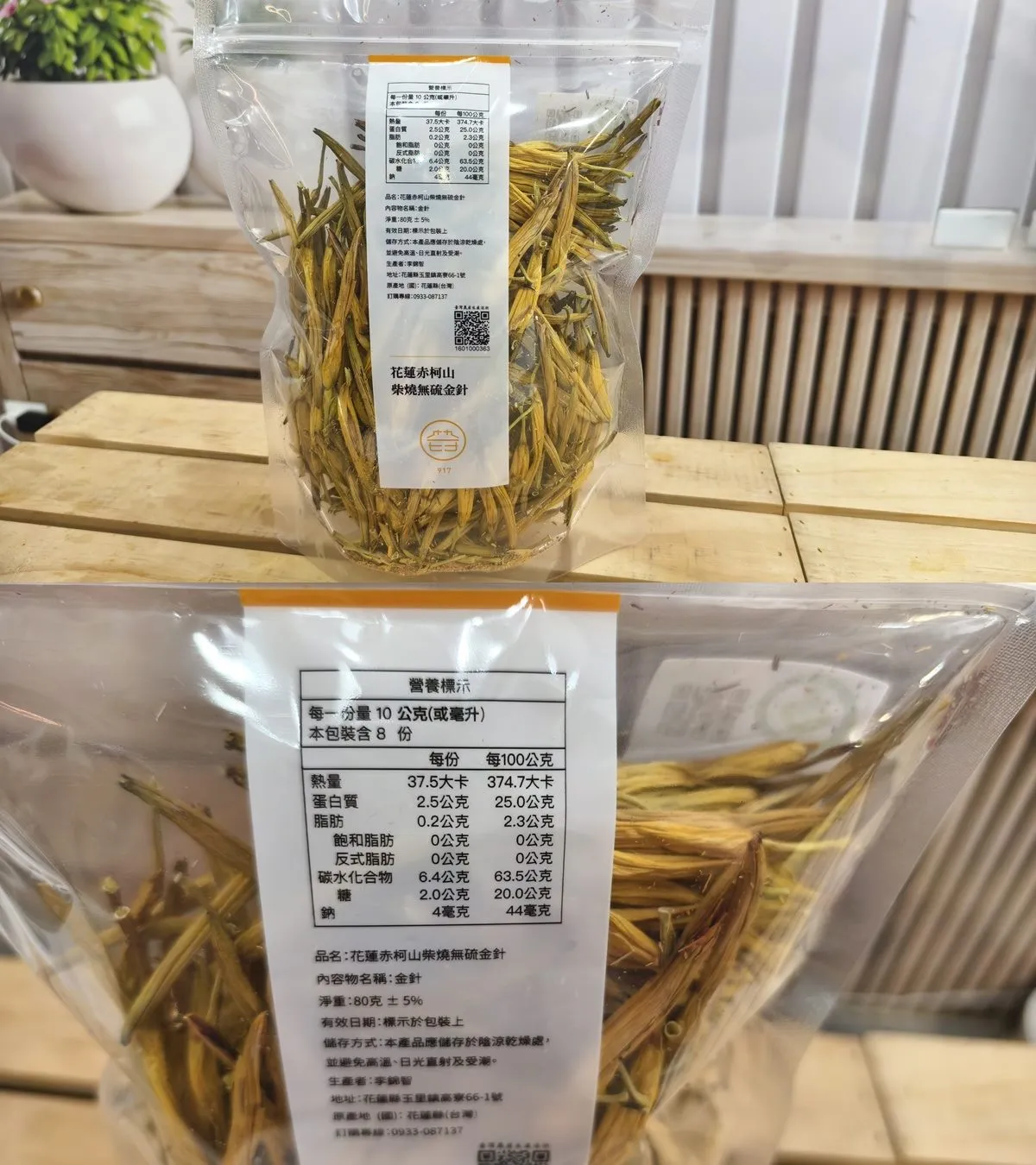 917農場的金針是採收下來的金針鮮蕾直接使用柴火烘乾 、低溫烘烤3天而成