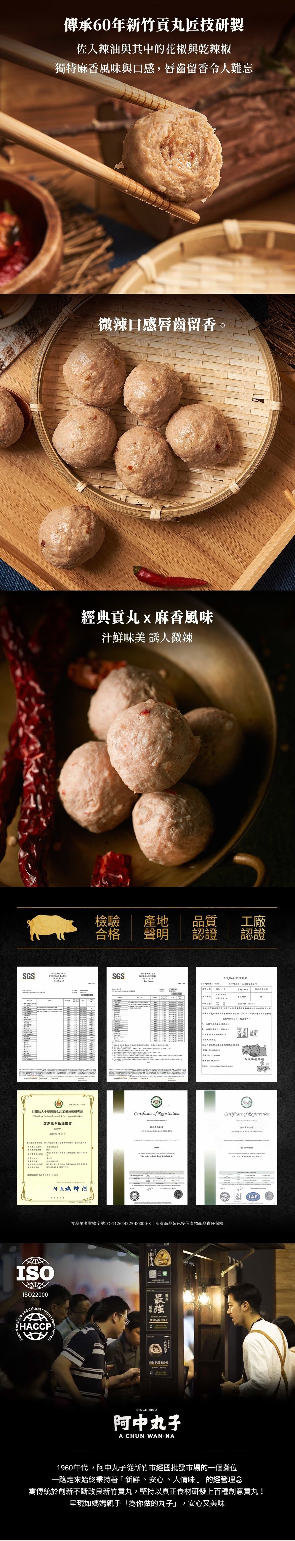 特選神農得獎牧場契作豬隻後腿肉,以傳承60年新竹貢丸匠技研製,佐入爆香後的花椒與乾辣椒,結合出令人無法抗拒的麻辣香氣,豐富獨特的風味餘韻悠遠