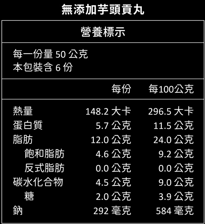 成分:豬肉、豬脂、芋頭、砂糖、岩鹽。*無添加衛福部公告之食品添加物。