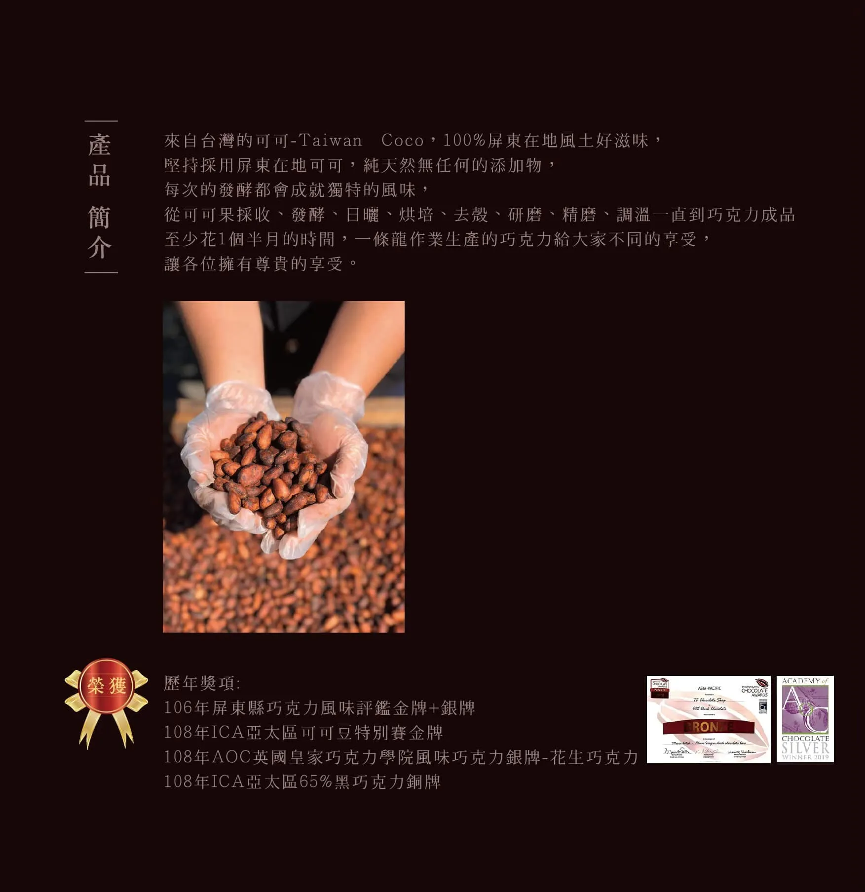 手工精挑出僅僅只有「3%」比例的特A級可可果,使用特殊工法進行發酵,大幅降低乳酸菌及醋酸菌帶來的酸氣,使發酵後的巧克⼒,帶有類似⽇本清酒的高雅風味。