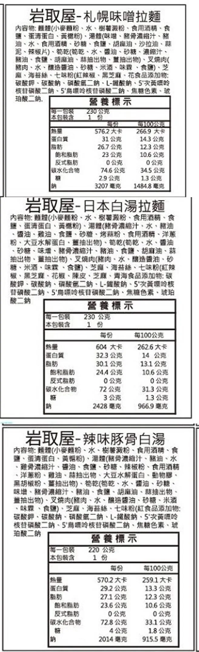 內容物:日本白湯湯體 2包+辣味豚骨湯體 1包+札幌味噌湯體 1包、日式生拉麵麵體 4包、日式叉燒肉 4包(單片肉)、日式筍乾 4包、海苔絲 4包、七味粉 4包、白芝麻 4包