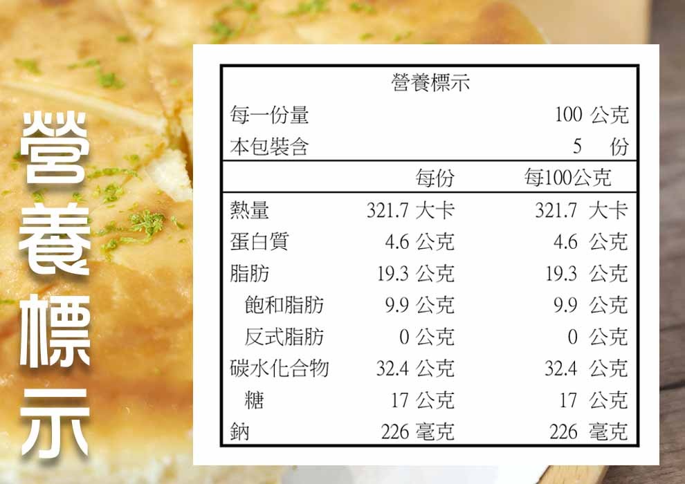 成分:澳洲卡夫乳酪、動物性鮮奶油、發酵奶油、英國全麥餅乾、砂糖、雞蛋、台灣檸檬、麻糬