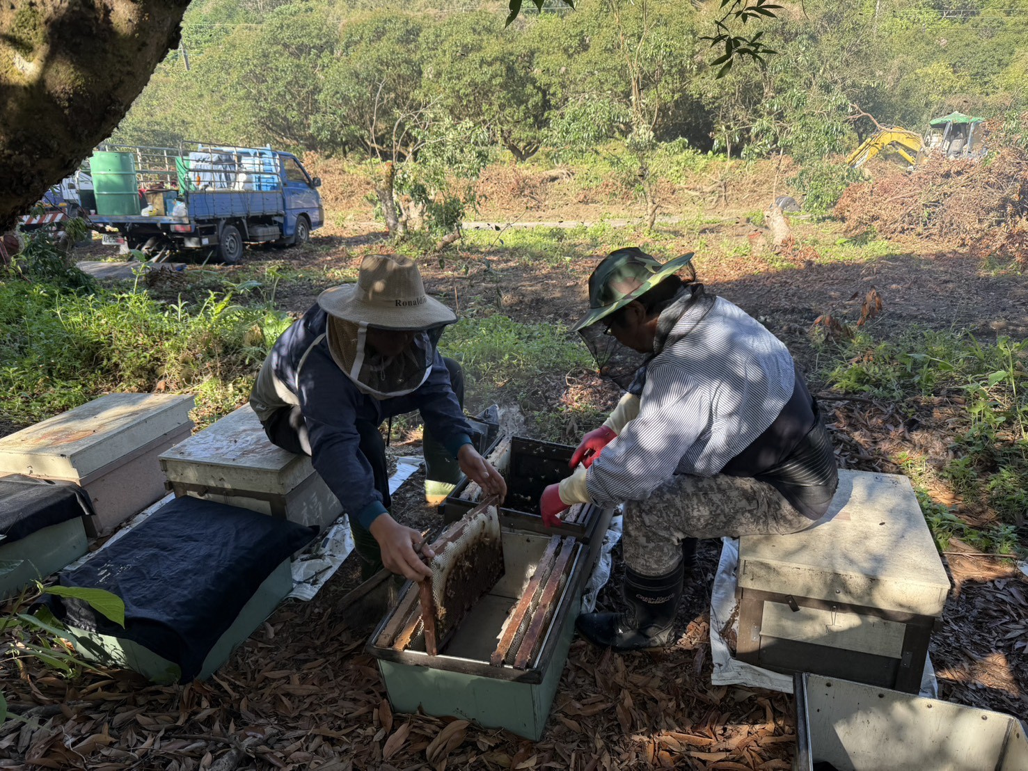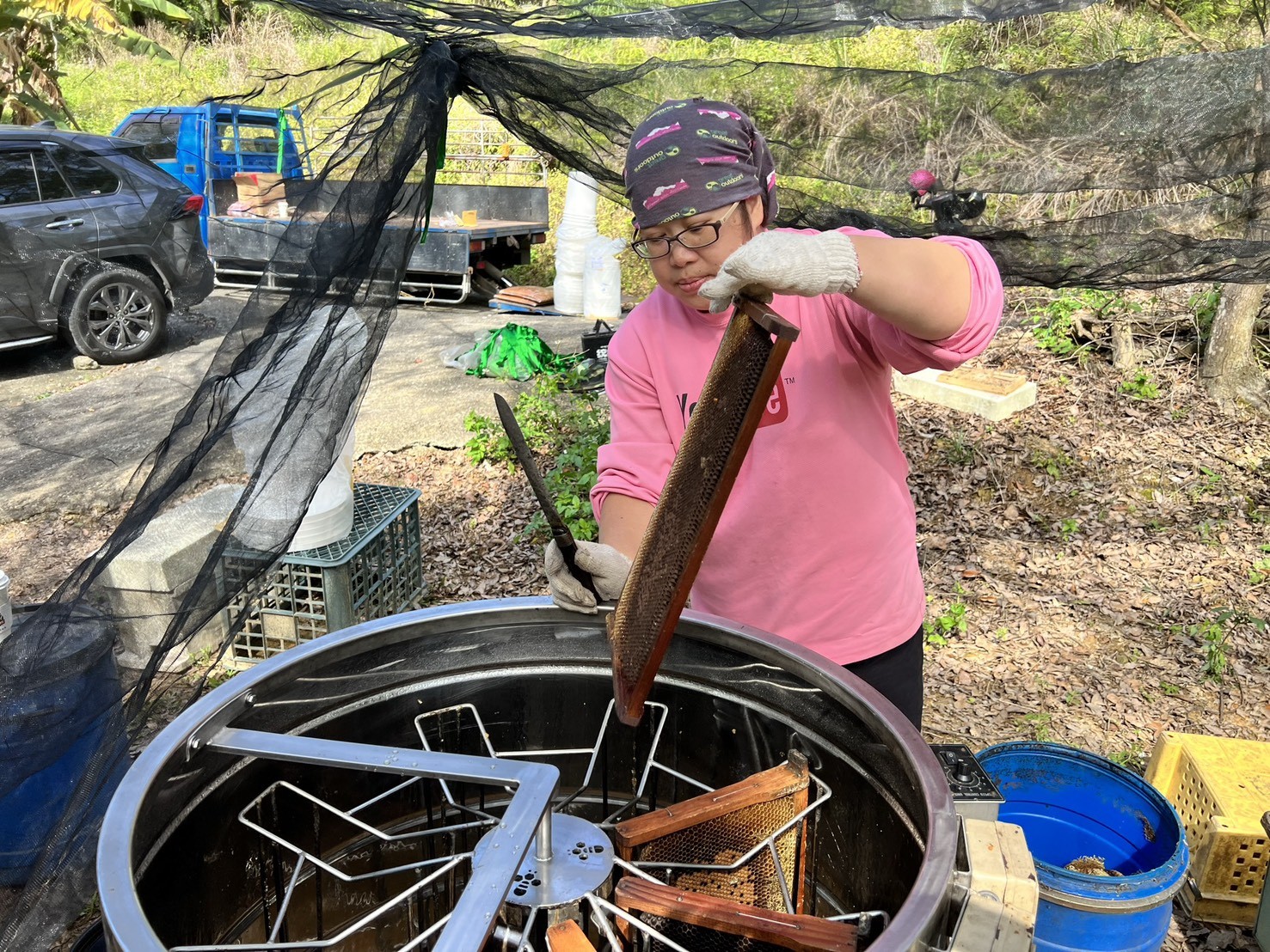 位於三峽的鼎盛養蜂場,蜜源以台灣中、南部為主,許多人提到蜜蜂會聯想到「危險」,但對吳大姐來說,牠們是值得守護的夥伴。她與丈夫一起經營的蜂場,從最初僅有一兩箱蜂群、設備簡陋,到如今已擁有 300 箱蜂群。