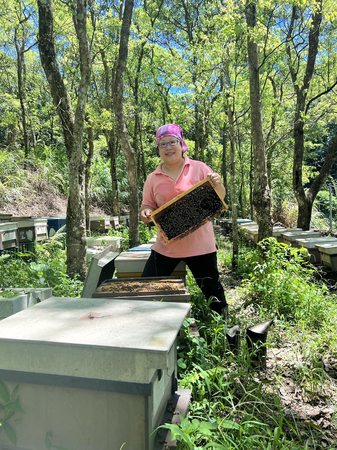位於三峽的鼎盛養蜂場,蜜源以台灣中、南部為主,許多人提到蜜蜂會聯想到「危險」,但對吳大姐來說,牠們是值得守護的夥伴。她與丈夫一起經營的蜂場,從最初僅有一兩箱蜂群、設備簡陋,到如今已擁有 300 箱蜂群。