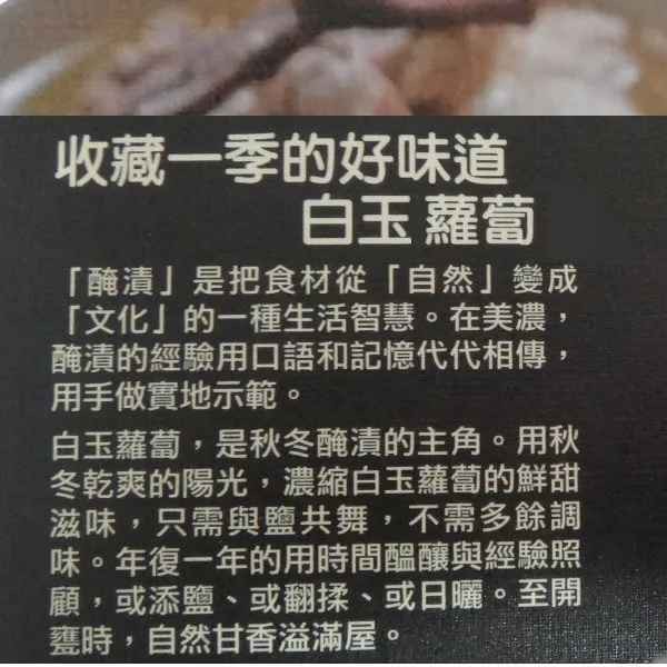 美濃鎮另一項特產「美濃白玉小蘿蔔」,蘿蔔,原本就是客家人長年喜愛的農作物,除了煮湯、當佐料,吃不完的蘿蔔,醃漬起來也另有一番風味。