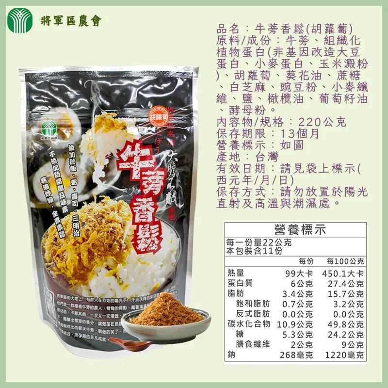 內容物名稱:牛蒡、非基因改造之植物性大豆蛋白、葡萄籽油、葵花油、蔗糖、芝麻、碗豆粉、鹽、小麥纖維、橄欖油、酵母粉。