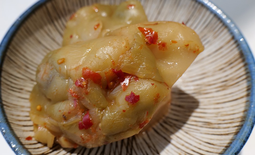 成份:結球芥菜、鹽、辣椒、醋磺內酯鈉(甜味劑)、L-麩酸鈉(味精)、食用色素黃4號、苯甲酸(防腐劑)0.6 g/kg 以下、偏亞硫酸氫鈉 0.03 g/kg 以下