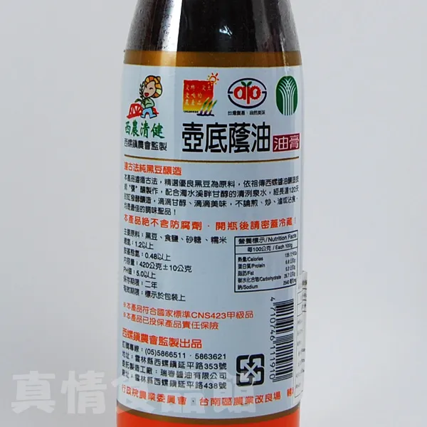 本產品遵循古法,精選優良黑豆為原料,依祖傳西螺醬油釀造技術「甕」釀製作,配合濁水溪畔甘醇的清洌泉水,經長達120天封缸發酵釀造,滴滴甘醇、滴滴美味,不論煎、炒、滷或沾食,均是最佳的調味聖品。