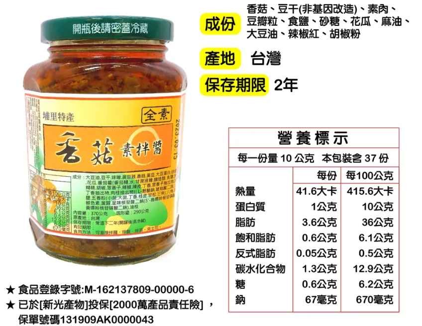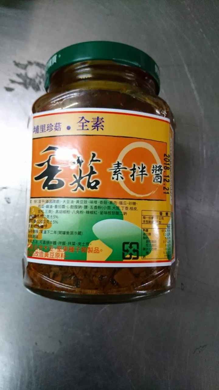 成份:香菇、大豆蛋白、蔭瓜、花瓜、黃豆、豆瓣粒、蕃茄醬、麻油、沙拉油、鹽、味素、糖、甘草粉等。