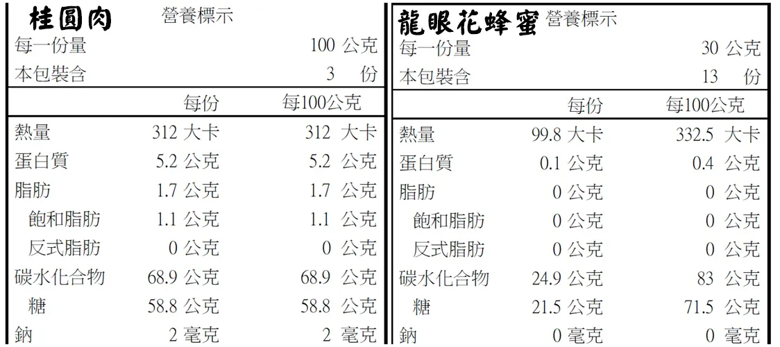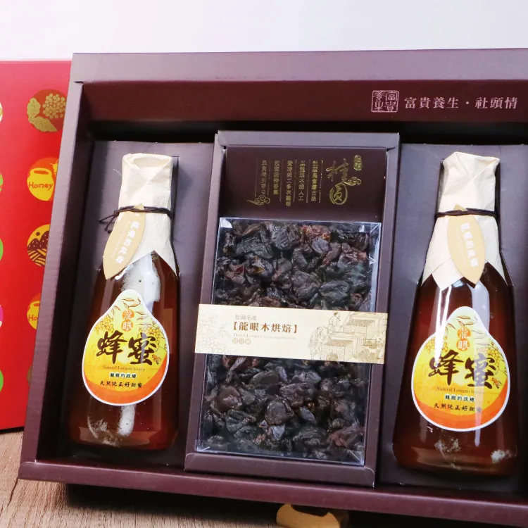 禮盒兩旁的龍眼花蜂蜜,又稱「桂圓蜜亅,蜜色呈琥珀色,食味甘甜,不易結晶,具有濃烈的龍眼的香氣。龍眼花蜜很適合做成各式蜂蜜料理: 搭配水果沙拉、加入熱茶中,或是塗抹吐司與鬆餅,都是不錯的選擇。