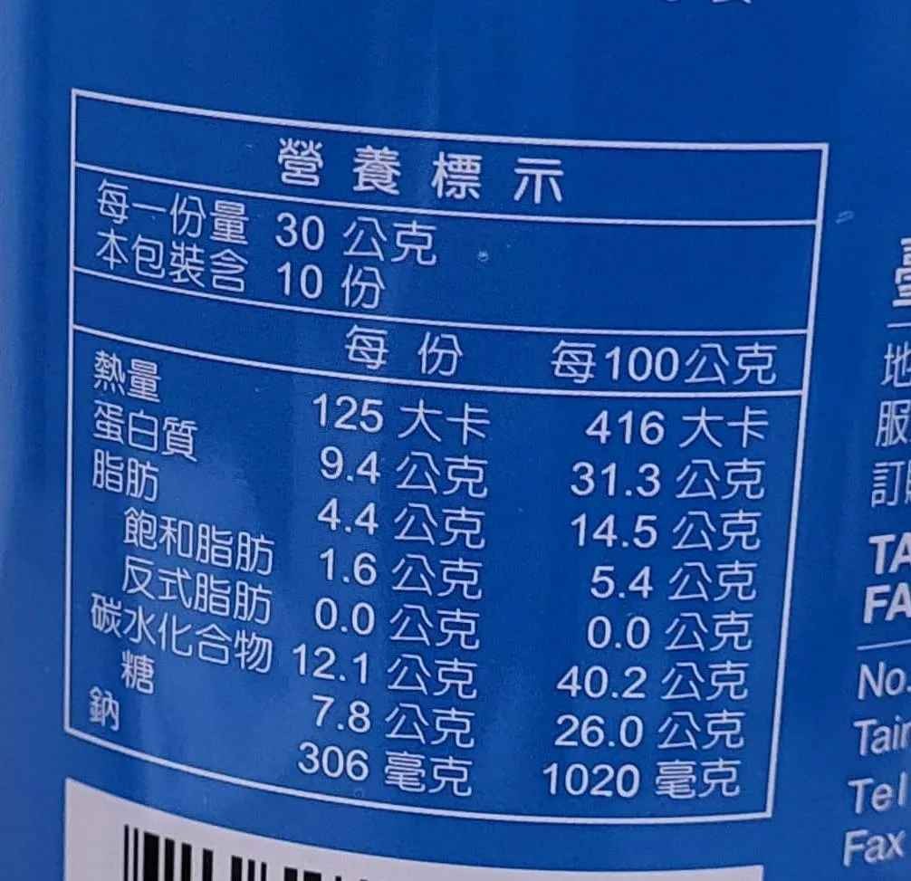 成份:虱目魚肉、旗魚肉、蔗糖、棕梠油、醬油、豌豆粉、鹽