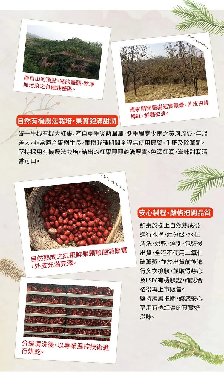 安心有機紅棗產自「世界紅棗之鄉」–陜西,地處黃河流域上之黃土高原,土壤肥沃,乾燥少雨、四季分明的氣候搭配充足的陽光,適宜棗樹栽種,搭配有機農法栽種,不使用農藥及化學肥料,結出的紅棗飽滿厚實,色澤深紅,皮薄、肉厚且核小,風味甜潤可口。