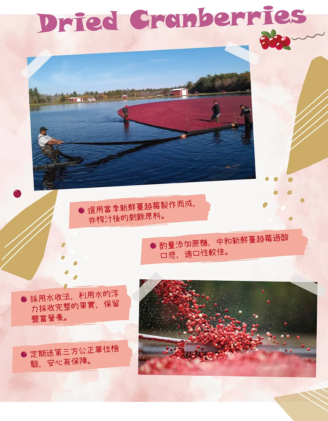 內容物名稱蔓越莓乾、蔗糖、葵花油。食品添加物:無。