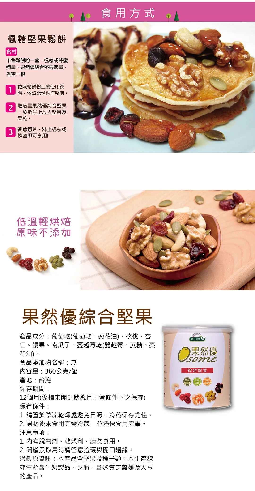 過敏原資訊:本產品含堅果及種子類。本生產線亦生產含牛奶製品、芝麻、含麩質之穀類及大豆的產品。