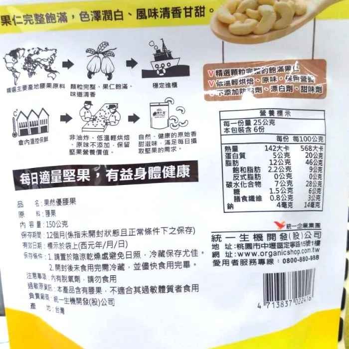 *不添加防腐劑、漂白劑、甜味劑 腰果味道甘甜,清脆可口,除了作為精力湯食材外,亦可當成零嘴食用或加工烤焙成其他食品。