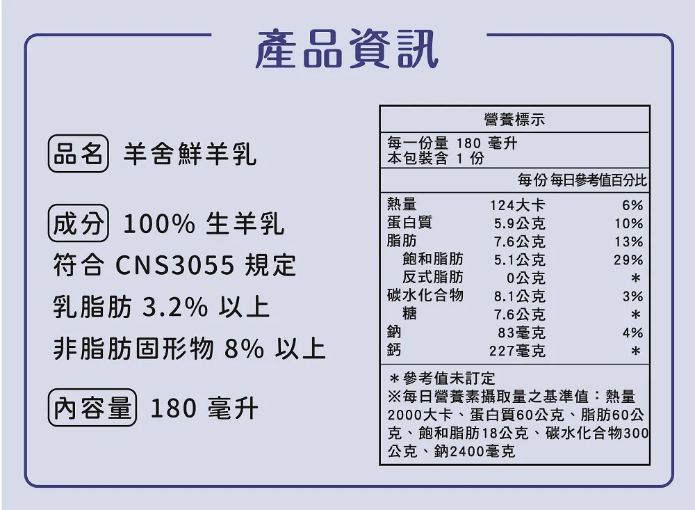 備註欄:100%生羊乳殺菌,無調整無添加。需4度以下冷藏,開封後請盡快食用完畢。請放於冰箱中層層板,勿放置於冰箱門旁,否將縮短保存期限
