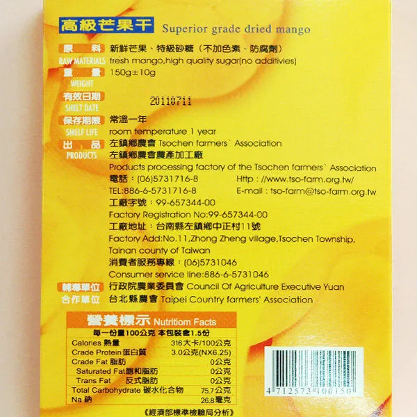 精選愛文芒果~ 每粒只取6片 由台灣芒果產業聯盟輔導,將新鮮芒果肉削成條狀,過糖浸漬後,乾燥而成。沒有加入任何添加物,所以芒果的原味都能完全保存下來,所挑選之芒果,都為精選果實,每粒只取6片,品質優良、口感極佳,風味更為獨特。芒果的營養價值 芒果富含醣類、蛋白質、粗纖維及維他命A、B1、B2、C,還有礦物質鈣、磷、鐵、鈉等營養成份。此外,芒果還含有胡蘿蔔素、葉酸、芒果酮酸。