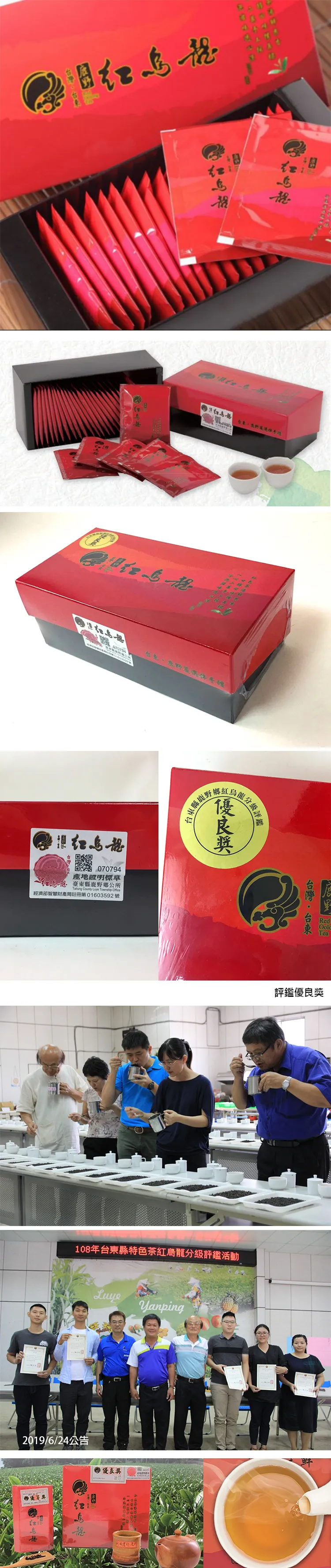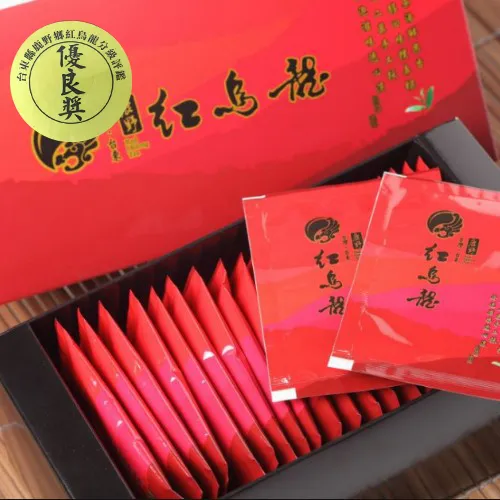 2018百大精品~紅烏龍茶包禮盒 臺灣茶業發展二百多年的歷史中,先民除了產製烏龍茶、紅茶、綠茶外,歷經辛苦的試驗研究,相繼研發出條型包種、東方美人、半球型包種茶,成為代表臺灣本土的特色茶。近年來臺茶受到進口臺式茶的衝擊,2008年茶業改良場臺東分場為突破鹿野茶區困境,積極建立鹿野茶區之特色,利用茶區生產之茶菁原料研製茶湯水色橙紅、滋味甘醇、適合冷泡之新興本土特色茶,有別臺灣以往產製的茶類,特命名為『紅烏龍』。紅烏龍主要的特色是冷熱泡皆宜,特別是冷泡法更能突顯滋味的甘醇。製作紅烏龍必須嚴選一心二葉茶芽以手工方式採摘,採取重萎凋、重攪拌結合部分紅茶製作法深度加工而成,所表現出的色香味有別於傳統清香型包種茶。紅烏龍的品質特色說明如下:1.紅烏龍外觀形狀為半球形色澤暗紅帶有光澤。2.茶湯水色琥珀橙紅,明亮澄清有如紅茶的茶湯色澤,滋味卻是烏龍茶風味。3.紅烏龍屬於發酵程度重、著重烘焙之烏龍茶,可當陳年茶典藏。4.茶質厚重具熟果香,滋味醇厚圓滑、耐泡、甘醇、為冷飲茶的上選材料。紅烏龍生津解渴,在泡沫茶飲和茶飲料市場極具發展潛力。