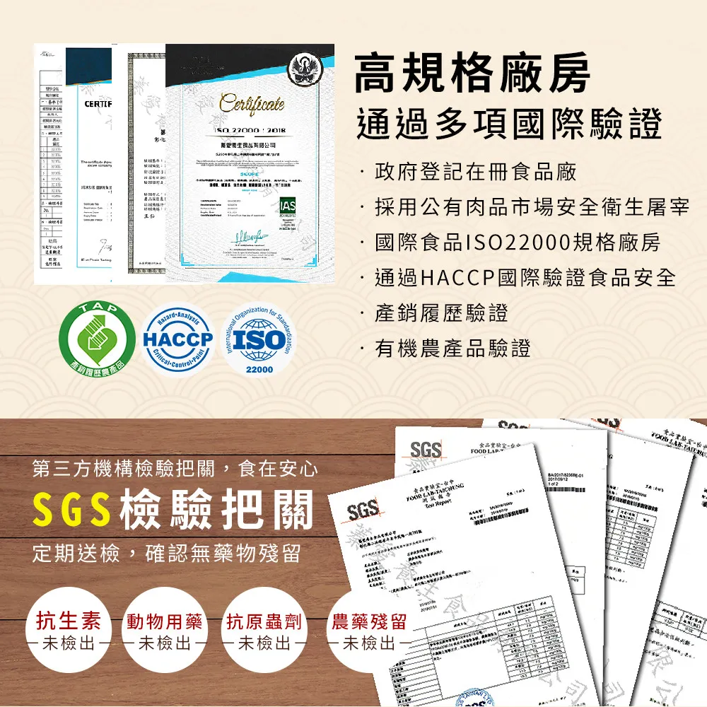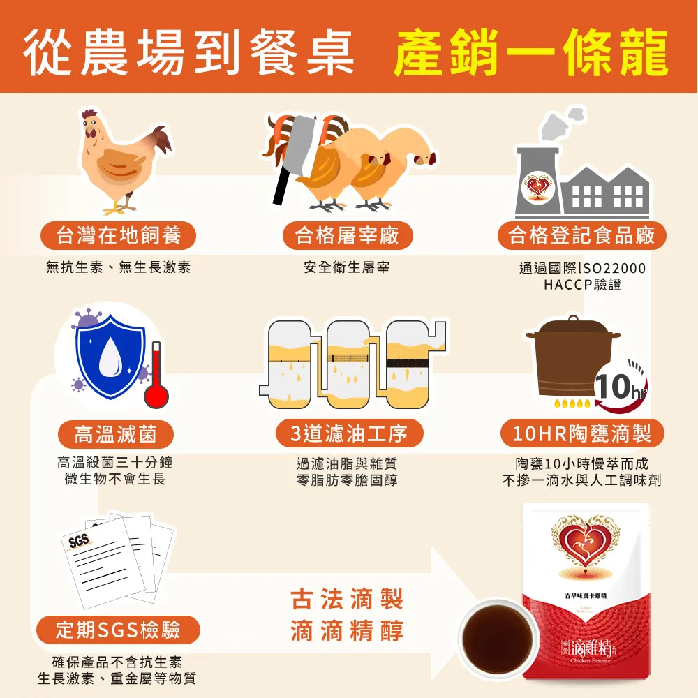 包含:飼養牧場、飼養方式(例:平飼 或 密閉負壓式水簾溫控雞舍等)、飼養禽種、上市週齡(12週齡以上的壯年雞隻),從源頭到滴精生產至包裝製程都有完整的生產紀錄,讓消費者食在好安心。