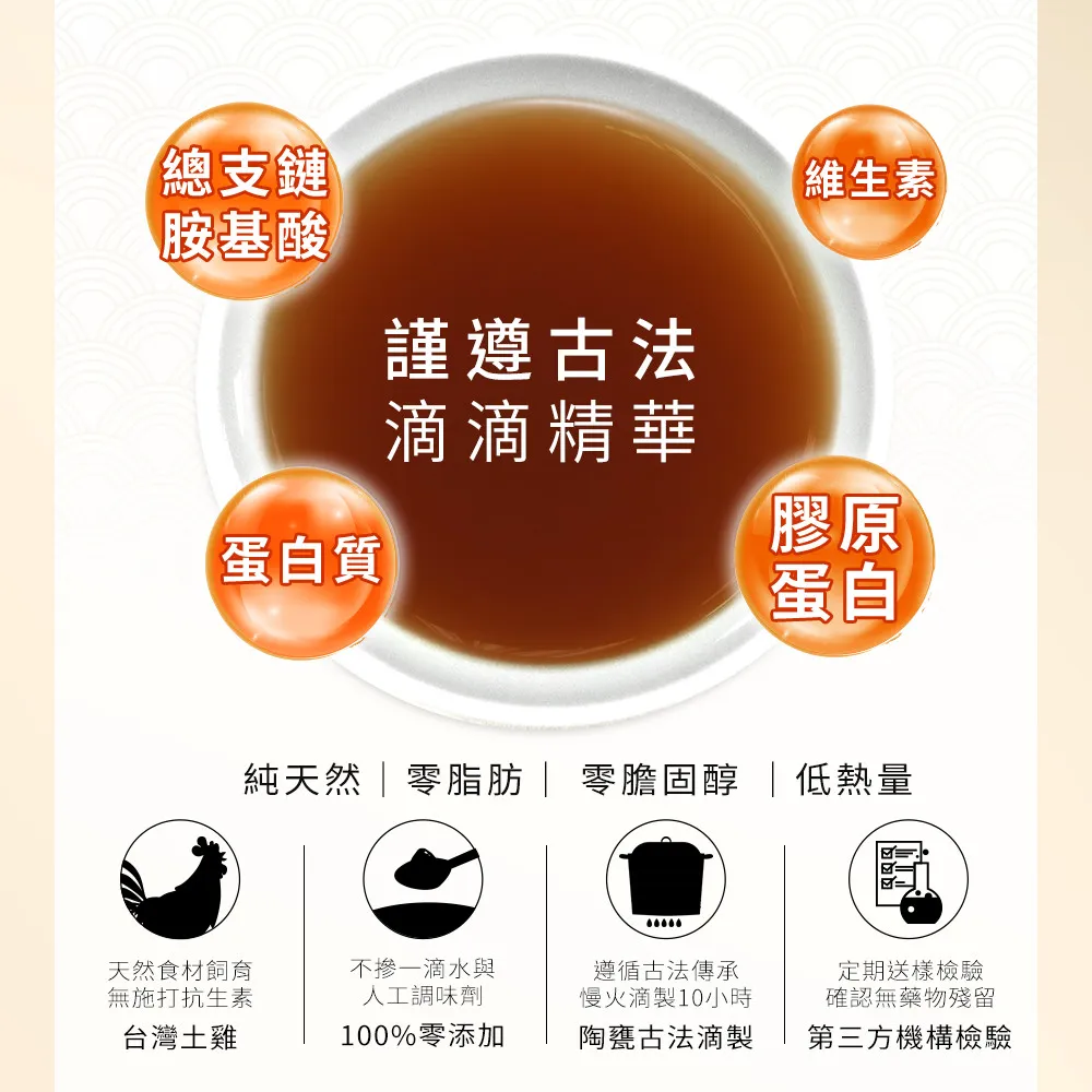 1.古法特製陶甕控溫蒸滴 2.100%純滴精不加一滴水 3.產銷履歷驗證虱目魚、產地直送全魚萃取 4.零脂肪、零膽固醇、低熱量 5.HACCP、ISO22000、產銷履歷驗證食品加工廠 【堅持從產地直送新鮮活魚、全魚萃取虱目魚精!】 魚精雖然營養,但常伴隨著濃烈的魚腥味,您是否因此對魚精感到卻步? 蓁愛經過反覆研發測試,發現魚精的口感與魚的鮮度及品質有莫大關聯。故有別於一般市售魚精使用冷凍魚加工,堅持從產地直送最新鮮的活魚、直接送到廠內加工滴製成虱目魚精;堅持真材實料使用整尾的虱目魚來滴製魚精,只有使用全魚滴製出來的虱目魚精,才能保留虱目魚原有的甘醇與鮮美! 【特製陶甕控溫滴製、全程不加一滴水】 虱目魚精的口感除了受虱目魚的鮮度與品質影響外,與滴製過程時間長短與溫度控制亦息息相關,蓁愛希望能重現記憶中阿嬤滴魚精的味道,特別尋找遵循古法,使用特製陶甕滴製魚精,利用陶瓷遠紅外線加熱原理,讓滴製過程中的虱目魚受熱更加地均勻穩定,經過十小時的緩慢滴製,全程不加一滴水,並以「無水陶甕蒸氣不回流」技術隔絕蒸氣回流稀釋,確保虱目魚精的品質穩定與絕佳風味。