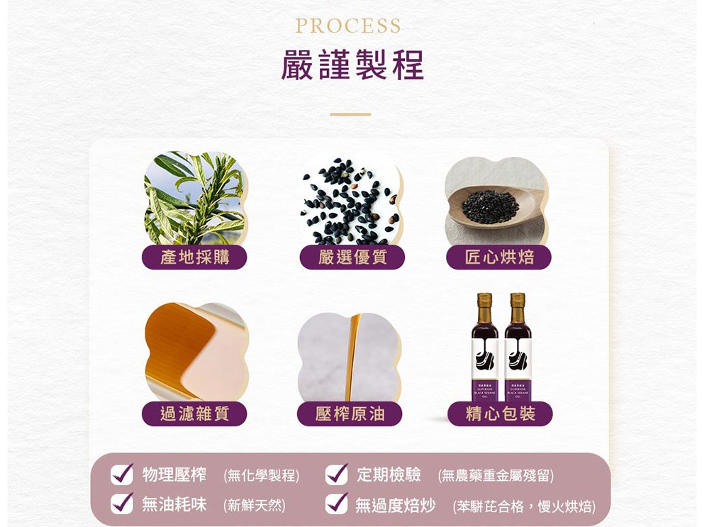 嚴選高品質黑芝麻籽,經人工篩選、低溫烘焙與自然熟成,保留最純粹的營養與濃郁芝麻香氣。