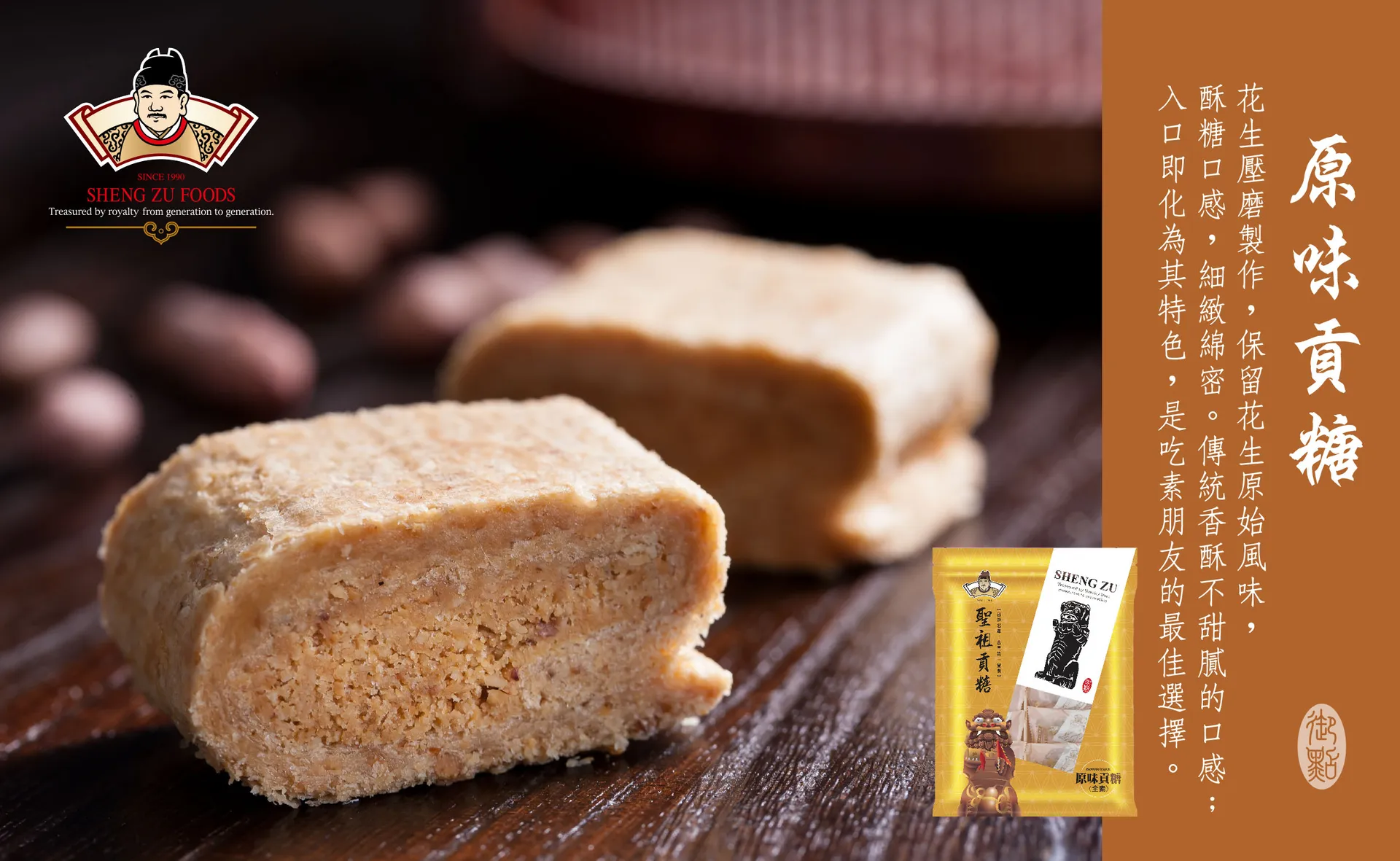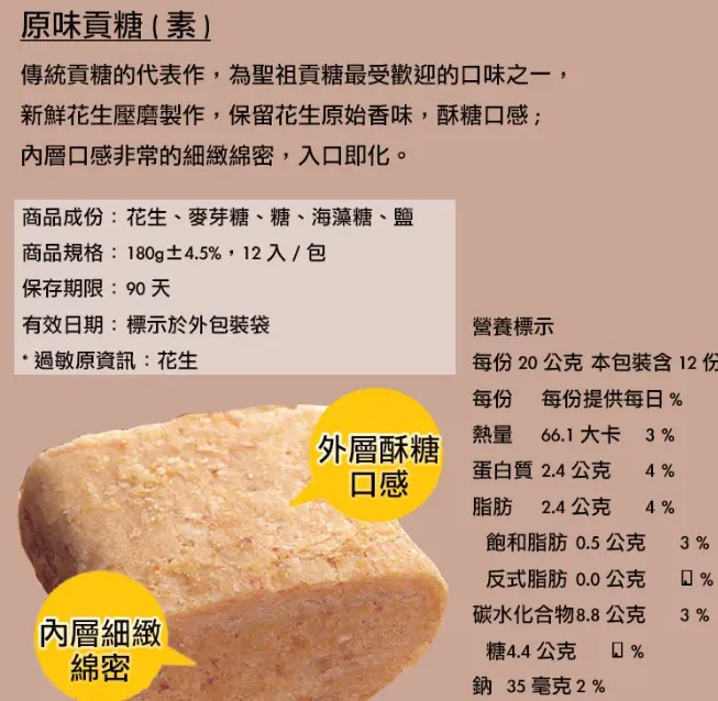 傳統貢糖的代表作,多年銷售佳績,廣受大眾喜好,花生壓磨製作,保留花生原始風味,酥糖口感,細緻綿密。香酥不甜膩的口感,入口即化為其特色,是吃素朋友的最佳選擇。
