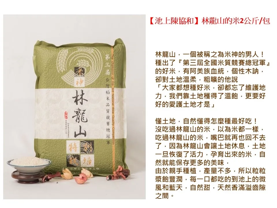 第三屆全國稻米品質競賽總冠軍-米神林龍山特別栽種