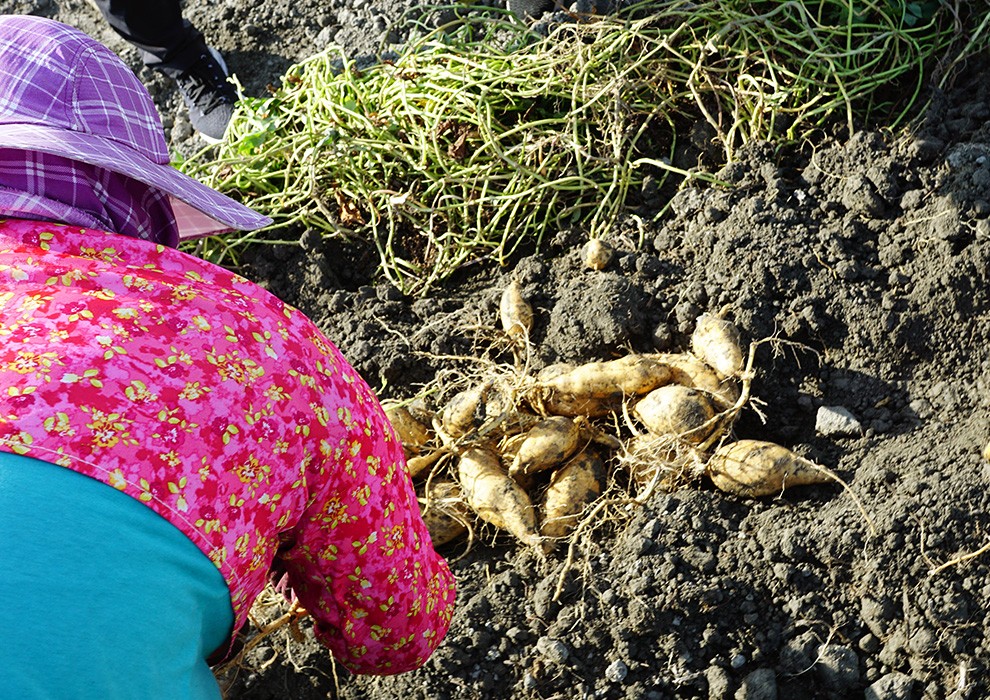 「哇!這地瓜是加了糖蜜煮的嗎?」,「哇! 這地瓜的口感怎麼這麼綿密?」每次在市集裡總會有人因為驚艷這樣的地瓜口感而停下了腳步,看看這一顆顆其貌不揚卻散發著誘人口感的作物。這就是李家爸爸花了十幾年的心血將自己故鄉平凡的作物-地瓜,透過修育土地、悉心照料、用心栽培的作物,努力的讓它成為您餐桌上更美味健康的好選擇。這個現在被譽為十大健康的食物,是我們從小在餐桌前從不缺席的食物。李大哥從工程業退休後,把鐵鎚變成釘耙,回家務農。重新種植起這我們日常中平凡的地瓜,想著如何讓它成為更受人歡迎的佳餚。